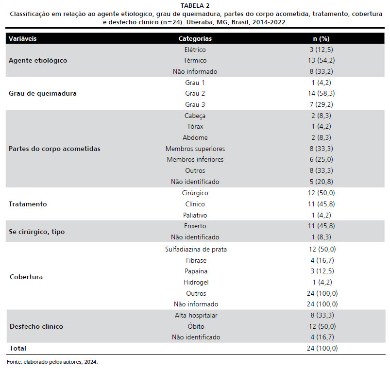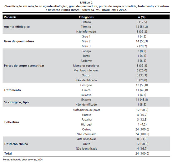 RESULTS: Of the 30 electronic medical records identified, 24 were analyzed, with ages ranging from 60 to 92 years (m=70.5 years, SD=8.325). Elderly males predominated (62.5%), the etiological agent was thermal (54.2%) and second-degree burns (58.3%). The most affected body part was the upper limbs (33.3%). The most commonly used surgical treatment was grafting (45.8%) and the coverage was silver sulfadiazine (50.0%). Regarding the outcome, eight (33.3%) patients remained hospitalized, 12 (50.0%) deaths were recorded and in four (16.7%) medical records it was not possible to identify the outcome.
