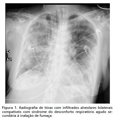 Durante a internação precoce, a paciente desenvolveu hipoxemia persistente com razão PaO²/FiO² <200 e radiografia de tórax com infiltrados alveolares bilaterais compatíveis com síndrome do desconforto respiratório agudo secundária à inalação de fumaça (Figura 1). Instituiu-se ventilação mecânica protetora (VT ~6mL/kg de peso previsto, PEEP 10-12cmH2O) e ajustes conforme gasometrias seriadas. O suporte intensivo incluiu ressuscitação volêmica orientada pela fórmula de Parkland e metas de débito urinário ≥0,5mL/kg/h, monitorização invasiva arterial e venosa e suporte nutricional enteral precoce. A fibrobroncoscopia realizada no 2º dia evidenciou edema e hiperemia de pregas vocais, sem necessidade de desbridamento endobrônquico ou realização de lavagem broncoalveolar extensiva, por decisão clínica face à estabilidade das secreções e risco de dessaturação.