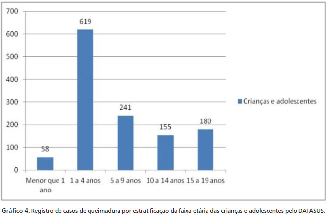 No entanto, no ano de 2019, observou-se uma frequência aumentada no grupo de crianças e adolescentes, na faixa etária de 0 a 19 anos, e nos demais anos, foi classificado abaixo do grupo dos adultos. Esses dados são confirmados em uma pesquisa, do ano de 2017, em que, dos 332 pacientes internados por queimadura em um hospital de referência do estado do Pará, 155 casos eram de crianças de 0 a 10 anos, com predominância de acidentes causados por contato com líquidos aquecidos14,15.