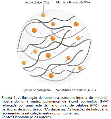 Nesse contexto, há crescente interesse no desenvolvimento de biomateriais com propriedades multifuncionais, visando à criação de um curativo ideal que atenda às diversas necessidades da cicatrização de queimaduras. O álcool polivinílico (PVA) destaca-se como polímero hidrossolúvel, biocompatível e de baixo custo, mas com limitações, como baixa resistência mecânica e ausência de ação antimicrobiana inerente2. A adição de nanofibrilas de celulose (NFC), de origem vegetal e sustentável, confere maior resistência estrutural e elevada capacidade de absorção de exsudatos3,4. Já o ácido tânico (TA), um polifenol natural, possui comprovada ação antimicrobiana, antioxidante e a capacidade de formar redes reticuladas estáveis com o PVA4-6.