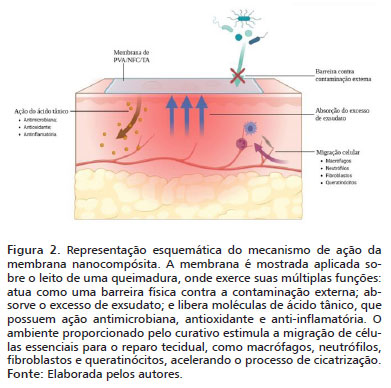 A revisão da literatura realizada evidencia que, apesar dos avanços, o tratamento de queimaduras ainda enfrenta desafios significativos, com terapias atuais muitas vezes ineficazes, desconfortáveis para o paciente e de alto custo. Considerando as lacunas dos tratamentos correntes, propõe-se teoricamente uma membrana que combinaria a capacidade de manutenção de um ambiente úmido e a flexibilidade do álcool polivinílico (PVA), a resistência mecânica e a alta capacidade de absorção das nanofibrilas de celulose (NFCs) e as propriedades reticulantes, antimicrobianas e antioxidantes do ácido tânico (TA). A proposta poderia contribuir para a aceleração do processo de cicatrização com maior segurança e controle, minimizando a frequência de trocas de curativo e, potencialmente, reduzindo o tempo de internação e os custos associados ao tratamento. Embora os dados dos estudos revisados sustentem a plausibilidade teórica da composição PVA/NFC/TA, é necessária a reprodução prática e experimental da membrana, a fim de realizar estudos in vitro e in vivo para validar sua real eficácia clínica e segurança.