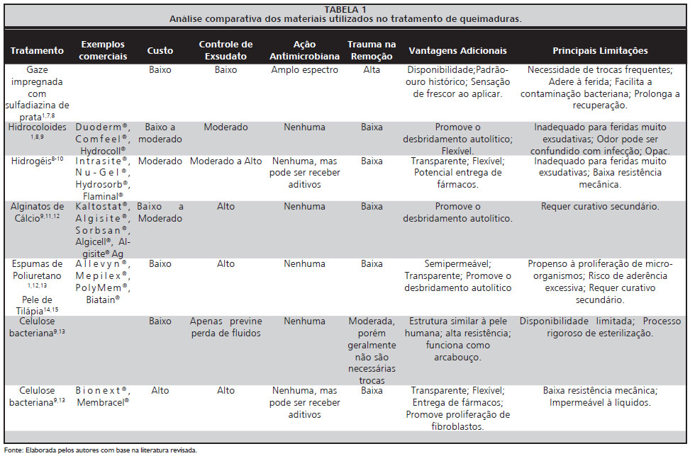 Desse modo, devido à carência de um tratamento único para todos os tipos de feridas, alguns materiais com propósitos diferentes foram desenvolvidos e aplicados ao longo das décadas, cada qual com suas vantagens e desvantagens, conforme sintetizado na Tabela 1.