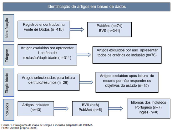 Nos achados da pesquisa foram encontrados 415 artigos; após refinar a busca com os critérios de exclusão, 28 trabalhos completos permaneceram. Desses, 13 artigos foram alinhados com os objetivos desse estudo e foram incluídos na revisão", demostrado na Figura 1. Depois de revisados e, para facilitar as análises das etapas, foram distribuídos em um quadro resumidamente, conforme mostra o Quadro 1.
