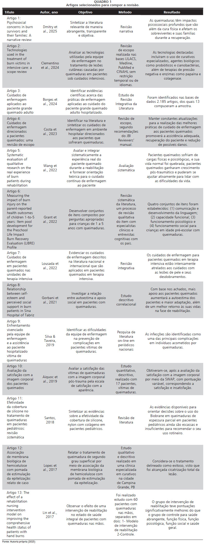 13. Koene GLC, Cunha NCP, Soares YN, Jastrow JMB, Saldanha PCO, Bezerra IMP. Pessoas com queimaduras: Concepções sobre o trabalho de Enfermagem na perspectiva de pacientes e profissionais. Rev Bras Queimaduras. 2022;21(1):59-68.