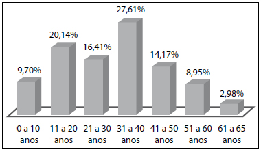 Figura 1 - Distribuiçao do trauma elétrico segundo faixa etária, na Unidade de Queimaduras do HCFMUSP, no período de novembro de 2001 a outubro de 2011.