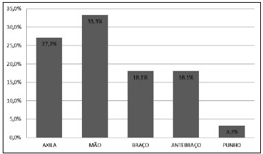 No presente estudo, nos membros superiores, a regiao mais afetada foi a mao com 33,3%, resultado que foi também semelhante ao descrito no estudo de Gangemi et al.