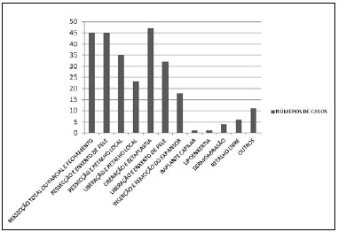 Em relaçao aos tratamentos cirúrgicos realizados, os resultados estao expostos na Figura 6. A zetaplastia foi o procedimento mais utilizado, seguido de ressecçao e enxertia de pele.