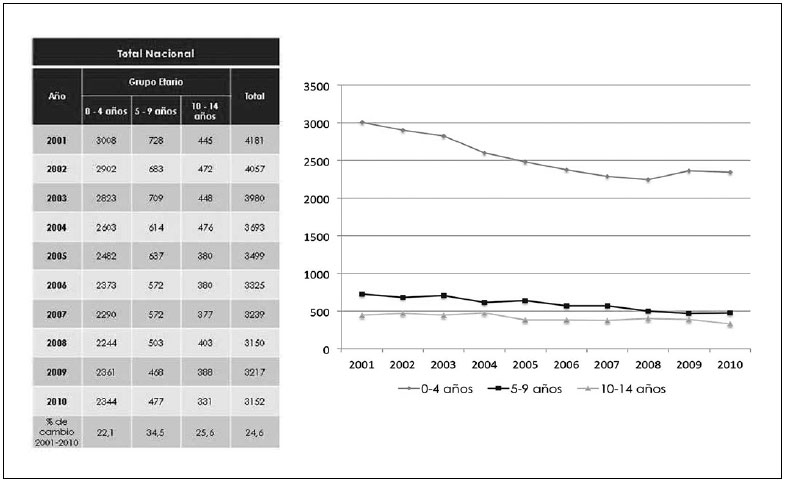 Nótese que las curvas de un gráfico pueden mover a engaño pues sus variaciones se atenúan si las cifras son de menor monto. En este caso el grupo que más disminuyó fue el de 5 a 9 años aunque visualmente no impresiona así.
