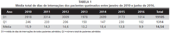 A média de internaçao dos pacientes internados por queimadura por acidente com álcool líquido foi de 26,63 dias, contrastando com os 14,54 dias de média de todos os pacientes no período de janeiro de 2010 a junho de 2016. (Tabelas 1 e 2).