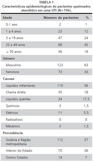 Quanto à procedência dos pacientes, 57% (n=112) sao oriundos de Goiânia e Regiao Metropolitana, enquanto 36% (n=70) vêm do interior do Estado e apenas 7% (n=14) de outros Estados da Federaçao (Tabela 1). Independentemente de seu local de procedência, 72% (n=141) dos pacientes sao atendidos nas primeiras 48 horas do acidente. Desses, 40% (n=78) foram atendidos nas primeiras 24 horas. Cerca de 40% (n=79) dos pacientes apresentavam alguma condiçao mórbida associada, como diabetes ou hipertensao arterial sistêmica. A média da área corporal queimada foi de 50%, variando de 5% a 95%.