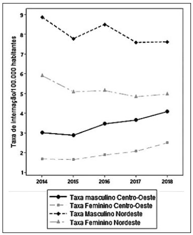As duas regiões apresentaram maiores taxas de internações no sexo masculino. O Centro-Oeste teve, inicialmente, uma diminuição, seguida por aumento constante tanto para o sexo masculino quanto para o feminino e oscilações na Região Nordeste, onde se tem para ambos o padrão de diminuição e aumento.