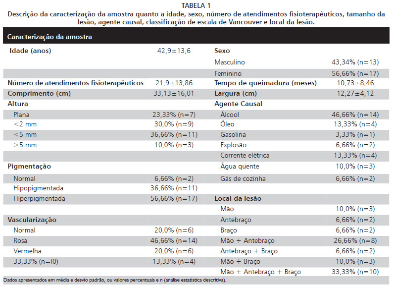 RESULTADOSForam avaliados 30 pacientes com cicatriz pós-enxertia em atendimento fisioterapêutico. A caracterização da amostra quanto idade, sexo, número de atendimentos fisioterapêuticos, tempo de lesão e características da lesão está apresentada na Tabela 1.