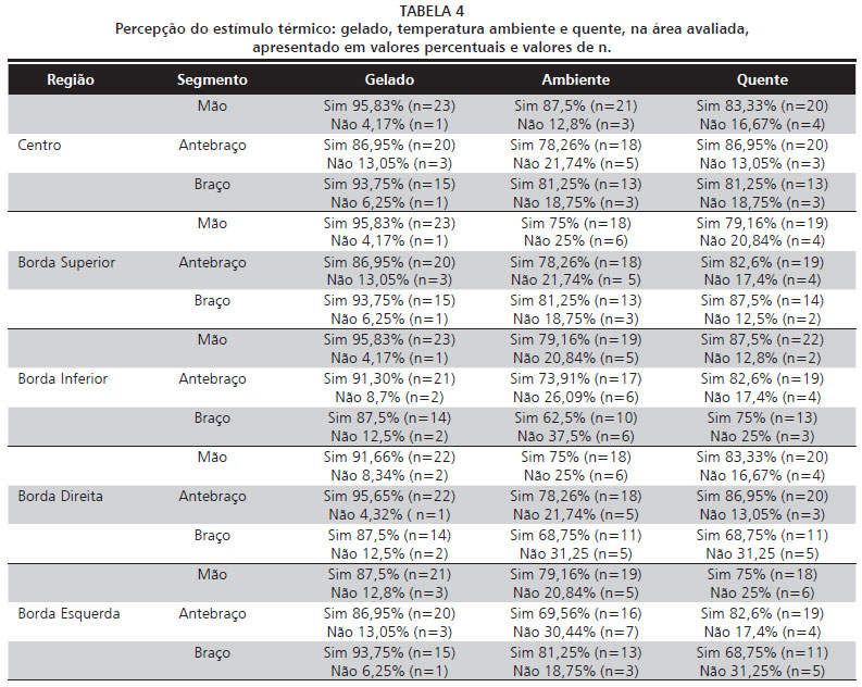Na análise da sensibilidade térmica, pôde-se observar que a maioria dos segmentos avaliados apresentam o teste positivo, ou seja identificaram a percepção do estímulo (Tabela 4).