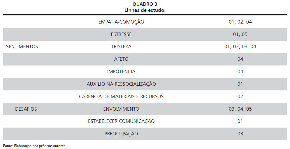 Após análise dos artigos, os mesmos foram organizados em linhas de estudo: Sentimentos e Desafios (Quadro 3).