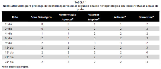 RESULTS: Statistical analysis showed significance for vascular neoformation (p<0.043), inflammatory infiltrate (p<0.004) and elastic fibers (p<0.001). The presence of inflammatory infiltrate was greater in those treated with silver sulfadiazine and Actcoat® than in those treated with Mepilex® (p=0.035 and p=0.019, respectively). Elastic fibers were greater in the Actcoat® and silver sulfadiazine groups compared to the control (p<0.001 and p=0.047) and were greater in the Actcoat® group than in the Aquacel® group (p=0.005). The wounds appeared to be epithelialized between the 9th and 12th day. Control group exhibited less inflammatory response, less presence of vascular neoformation and the presence of elastic fibers.