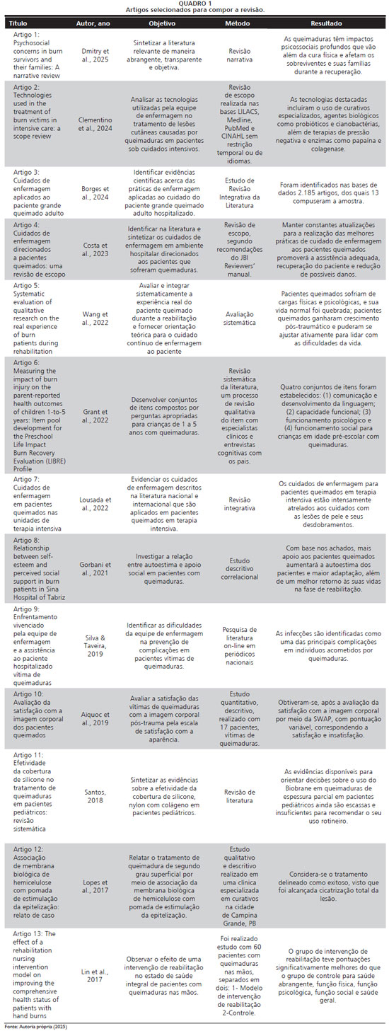 13. Koene GLC, Cunha NCP, Soares YN, Jastrow JMB, Saldanha PCO, Bezerra IMP. Pessoas com queimaduras: Concepções sobre o trabalho de Enfermagem na perspectiva de pacientes e profissionais. Rev Bras Queimaduras. 2022;21(1):59-68.