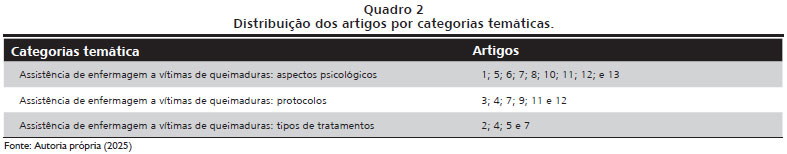 Logo após a leitura do Quadro 1, foram agrupados em eixos temáticos, resultando em três categorias: Assistência de enfermagem a vítimas de queimaduras: aspectos psicológicos; Assistência de enfermagem a vítimas de queimaduras: protocolos; e Assistência de enfermagem a vítimas de queimaduras: tipos de tratamentos, conforme é demonstrado no Quadro 2.