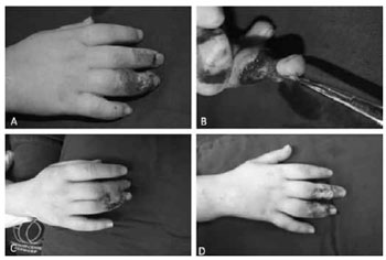 A: Paciente do sexo feminino, de 4 anos, apresentando queimadura elétrica (baixa tensao) do dedo anular direito, com comprometimento do tendao extensor e exposiçao óssea da falange distal.